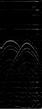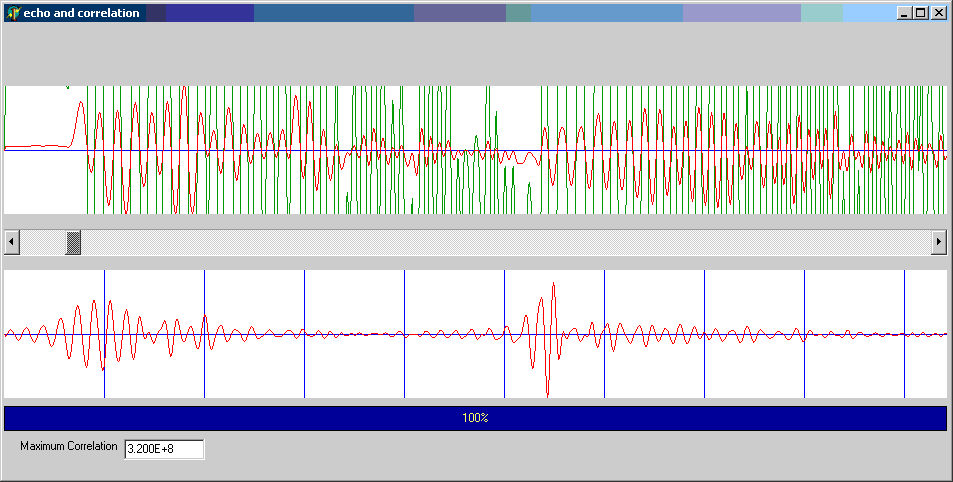 This is a chirp and echo off my ceiling. The top trace shows the waveform recorded by the PC mic. It is plotted in with two scales because the dynamic range is too high to display the both the large and small signals with one trace. On the left you can see the direct wave – straight from speaker to mic. Just after this ends the reflection arrives. For close targets the direct and reflected chirps overlap. This isn't a problem in current setup but is a limitation if the same transducer is used as both a speaker and mic. It is somewhat difficult to interpret the raw signal by eye. For such a simple target you can see what's happening but any subtle echo would be lost. |