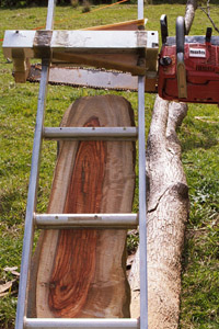 The chainsaw mill is not the only type of portable sawmill. I've seen an excellent rotary saw based system which will produce a superior cut - but it's out of my league price wise and not as portable as my system. There are also systems which use a chainsaw engine to drive a bandsaw - of example "the wood mizer” nice but again not likely to be in my price range. The chainsaw has the advantage of being relatively cheap, widely available and well supported when it needs service (eg, sharpening). On the down side it produces a fairly rough cut and turns about 7 mm (>1/4 in) of timber into sawdust. I know of several chainsaw based systems... One is the Canadian "Beam Machine" - a cheap (US$40?) attachment to guide the saw along a 2 by 4 inch piece of timber which is nailed to the log as a guide - crude but cheap. Another is a local (Beerwah-Qld) product call the "Ripper", I think the current model is mark IV. The ripper is a nice unit which works by running a bearing assembly along a steel bar, this is attached to the motor end of the chainsaw bar - the price is AU$900. Both systems are intended to be used with the saw bar vertical - so the log needs to be raise off the ground to allow the saw to cut through without hitting the ground. The ripper type system has advantages over mine for certain types of work such as parting (splitting) logs, cutting very thick slabs/beams and doing diagonal cuts. I'd expect the ladder-mill to be more accurate and easier to use for small logs and certain shapes of logs will suit one system more than the other. I'm thinking of modifying my setup to be able to do cuts at 90 deg to the ladder so I'd get the advantages of the ripper style setup as well - the main problem I see with this modification is that if the log was to fall over (It shouldn't) the mill could be seriously damaged (so could I). See my links for other mills.