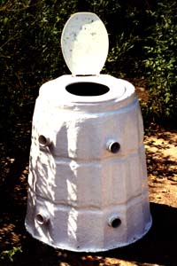 This is it - the Dalek loo. So far it's working very well but it's only been in use for 3 months (since easter 1998). The loo was made by fibre-glassing a compost bin with an old toilet seat at the user interface end and fly proof vent holes fore and aft. A fan may be fitted in future but doesn't seem to be needed at the moment. This loo is a "batch" type - when it's full some years from now it will most likely be left in place and new toilet built to replace it. Later when the composting is complete the toilet can either be emptied or lifted off the pile and moved somewhere else. The vent holes are standard plastic plumbing fitting and can be sealed off with screw on caps.