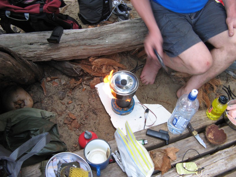 We began to set up our cooking stuff on a bench previous campers had made from driftwood. This was to be the first serious test for my home-made turbo stove. Well guess who left the battery pack at home. I had a scrap of solder and a mini gas torch so I improvised a pack from some of the AA batteries I had with me. This worked and I cooked a meal of instant spuds with peas along with fried spam.