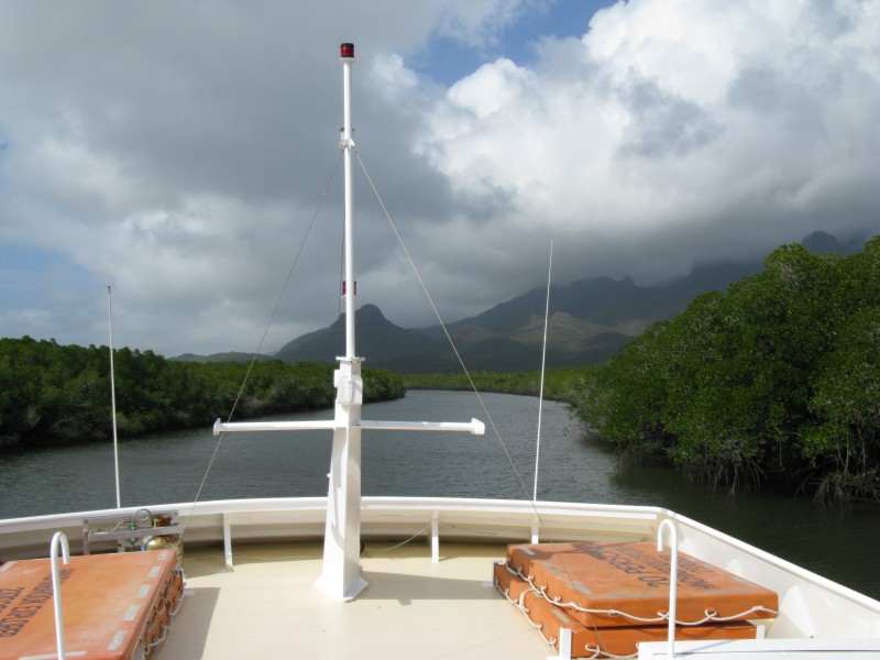 | Cruising a channel between the mangroves. This almost reaches the beach on the ocean side of the island. |