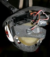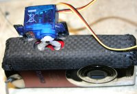 I made a wax replica of the camera top so I could make a carbon cover for it which I mounted a micro servo on. This can hit either the “on” or “shutter” button. I would like more clearance between the servo arm and the buttons but there wasn't enough servo travel to use the servo arms which were at 180 degrees and there wasn't time to make a custom servo wheel. This arrangement did work on the ground.