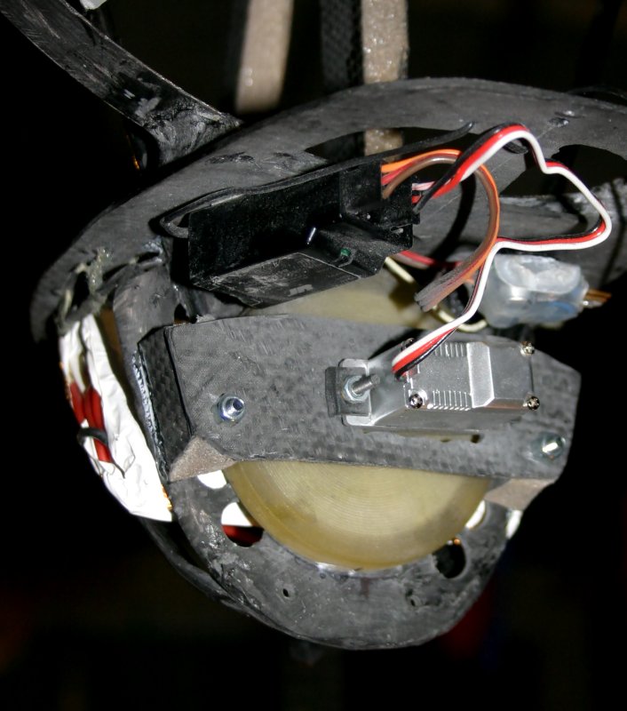 The heavy servo was being replaced anyway so I removed it along with it's mounting blocks and lashed the servo mounting bracket down with cotton instead of the kevlar I used in other places. Cotton isn't as strong but it is easier to work with.
