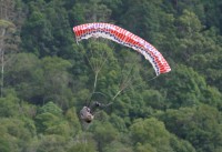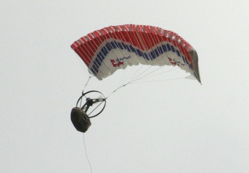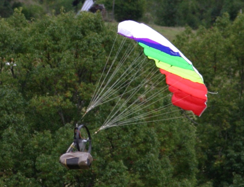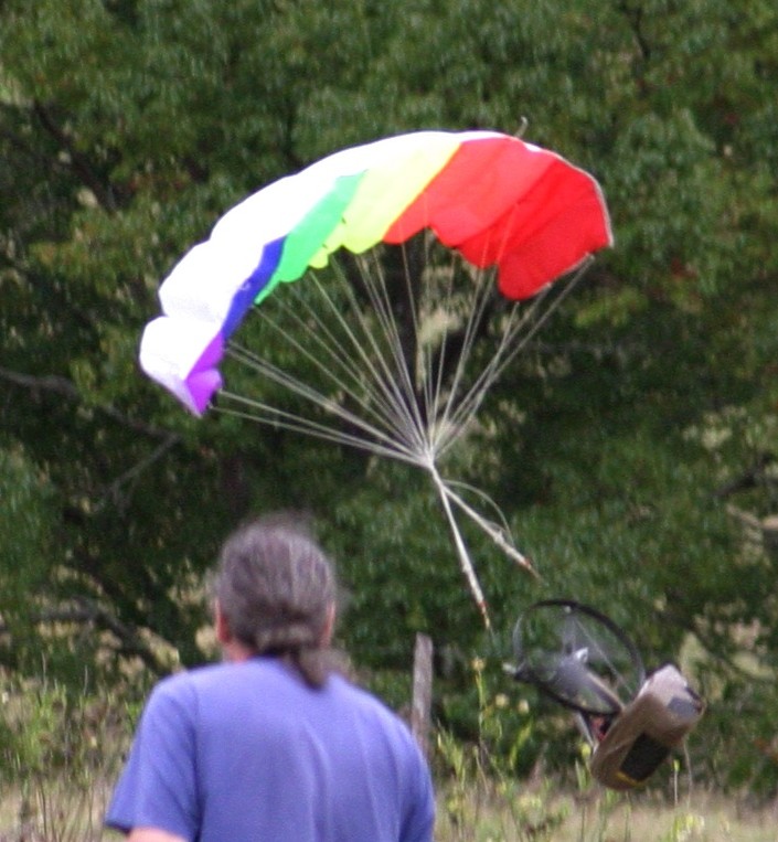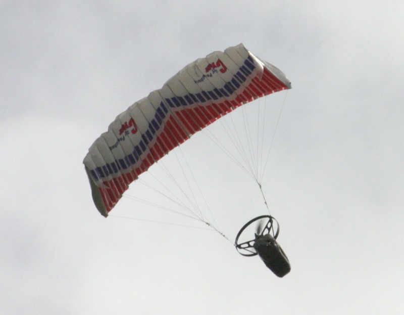 On my last flight the chute inflated well and it staggered up to maybe 20 meters. I progressively reduced power till I had more or less level flight and reasonable steering. Then the motor seemed to glitch and then stopped.