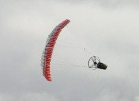 The kite will inflate and fly only using low power – just enough the climb slowly. Even a small increase will cause the gondola to spin and wind the lines up (if it doesn't hit the ground first). You can see I've used lots of plastic packing tape to make it more crash worthy and I've taped a soup spoon to the front to increase the weight.