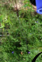 The surfer uses a 4 line rig – most models use two lines. Two line is usually referred to as “weight shift” steering but I'm not sure this is accurate. Anyway in order to fly a surfer style chute on my contrivance I had to figure out how to convert it to two lines. After some guessing and test flying the rig shown here works. It may still need some tweaking but it flies.