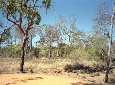 The collapsed tubes can be seen from a distance because the different vegetation in them. They shelter a dry rain-forest. Dry rain-forest strikes me as a rather dumb name. The tube contains this forest not because it rains there (imagine long rain clouds 10 meters wide just raining in the tubes) it is there because the plants are fire sensitive and the walls keep fire out. At this time of year the trees in the tubes have lost their leaves and stood out from the surrounding bush.