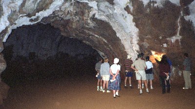 A long time ago 30 K from here there was a volcano. We now call this volcano Undara. Undara was not a large volcano nor was it violent in comparison to its neighbors – but it produced a huge amount of lava. The lava flowed out seeking lower ground and covered a huge area to a depth of many metres. The lava solidified on the surface while the depths remained liquid and sometime flowing at high speed. Eventually Undara slowed and stopped. The solid crust remained but some of the molten rock flowed away leaving a glowing tubular void. It is unknown how many tubes there are or where. We only know about those which have shown themselves due to partial or total collapse – or by observing (or smelling) bats which have found small openings into them. The tubes are probably the best in the world because they have been protected from unsupervised visitors. For this reason and the danger of getting lost in the region or inside a tube (some are very dangerous) the public can not see the tubes without a guide. Our guide for a day tour was Val Speedie and an excellent guide she is.